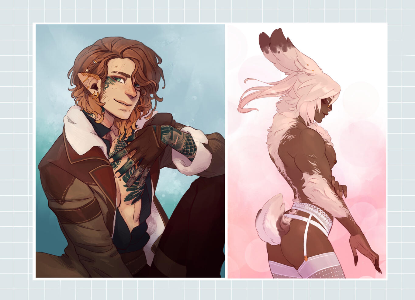 ✦ If using in game screenshots for reference please make sure they are well lit and accurately reflect the colors you want.✦ If you need help taking reference photos please consult this helpful guide!✦ If there are any extra details present on your character please make sure to mention them (scars? tattoos? massive muscles? Any features not available in game?)✦ I will not, by default, assume that you want a Viera or Au'ra character drawn with my personal headcanon features (tail, anthro-furry feet/claws, furry/scaley chests and forearms) If you would like these features included on your character please let me know✦ If your commission includes G'raha please let me know if you would like him more on model or with freckles (in my own personal style)